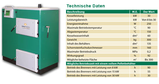 Der Neotherm Pelletofen mit einer Betriebsleistung bis 30 kW und einem automatischen Anzünder läuft mit dem ökologischen Brennstoff Pellet. Der Kessel ist als Wärmefaktor für Heizungsanlagen bestimmt und kann Pellets mit einem Durchmesser von 6 - 8 mm sowie einer Länge von 10 - 50 mm problemlos verbrennen. Der Vorratsspeicher der Pellets garantiert eine lange Arbeitszeit und begrenzt damit das ständige Nachfüllen!